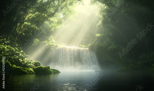 Serene waterfall surrounded by lush greenery and soft rays of sunlight filtering through the trees.