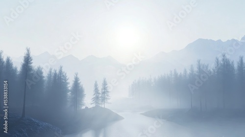 Serene Winter Landscape with Misty Mountains and Calm River Under Soft Light at Dawn