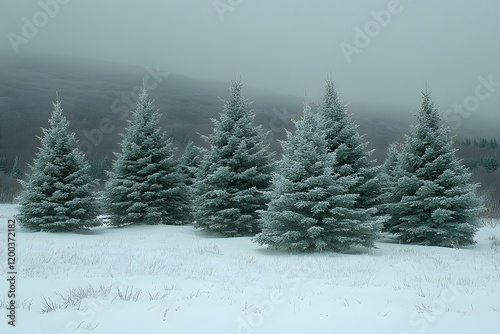 Serene Winter Landscape with Snow-Covered Pine Trees in a Misty Forest