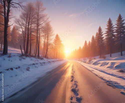 Serene winter road winding up to a radiant sunrise, dawn, serene