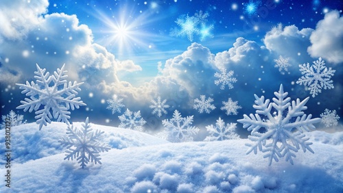 Serene winter wonderland scene featuring a thick blanket of fluffy white snowflakes gently falling against a soft, creamy blue sky with puffy white clouds.