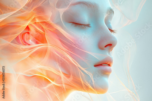 Serene woman's face enveloped in warm, ethereal, flowing fabric.