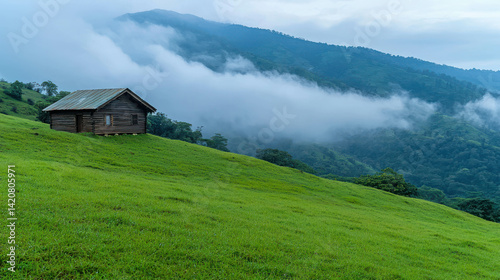 Serene Wooden Cabin on Lush Green Hill Surrounded by Misty Mountains at Dawn
