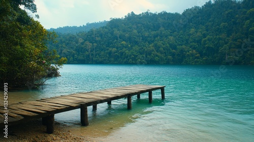 "Serene Wooden Dock Overlooking Turquoise Jungle River"