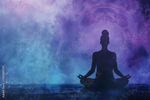 Serene Yoga Meditation: Silhouetted Figure in Lotus Position with Ethereal Mandala Backdrop in Calming Colors