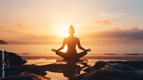 Serene yoga session at sunrise, silhouette of a person in a meditative pose on a tranquil beach, embodying peace and mindfulness