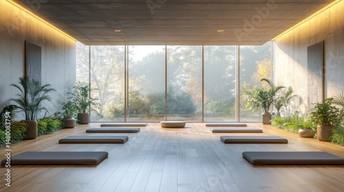 Serene Yoga Studio with Natural Light, Minimalist Design, and Tranquil Atmosphere Surrounded by Greenery