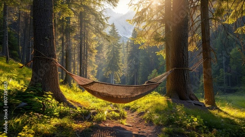 serenity in nature, a snug hammock swaying softly between two tall trees in a peaceful forest clearing, ideal for meditation and relaxation surrounded by natures tranquility