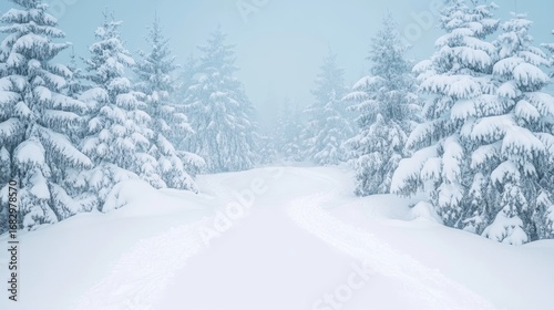 Serenity Unveiled A Snowy Pathway Through Winter Woodlands, Inviting Peaceful Exploration and Calm