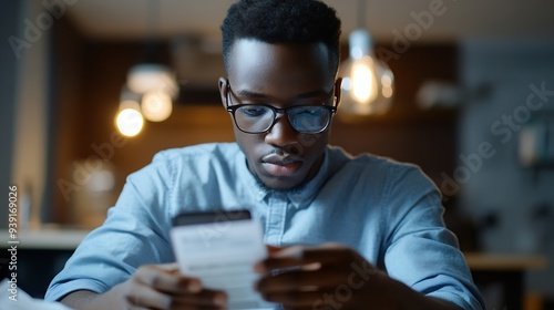 Serious and concentrated young AfricanAmerican male wearing spectacles paying bills online using banking app on his mobile phone People paperwork finances family budget and economy con : Generative AI