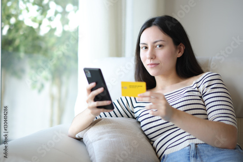 Serious asian woman buying online looking at camera