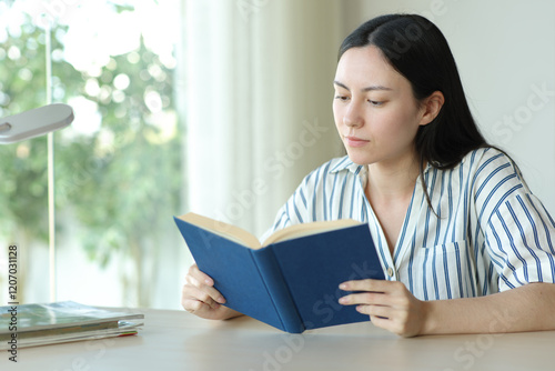 Serious asian woman reading a paper book on a desk