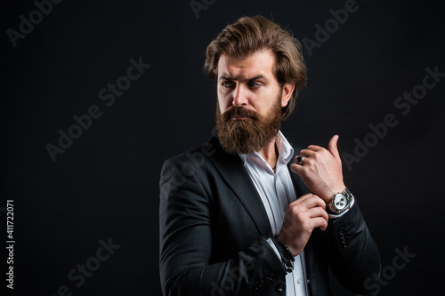 serious bearded man. handsome and successful man in expensive suit. He in shirt with hand watch. stylish successful man in suit posing. business man wear suit. official office lifestyle. copy space