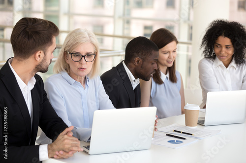 Serious focused diverse office employees group talking working on online laptop project, multiracial young and old office workers team using computer software training interns, mentoring, discussion