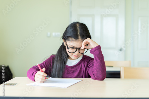 Serious girl writing on a blank paper in classroom,education and school concept.