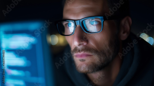 Serious male programmer coding at night with computer screen reflecting in his glasses.