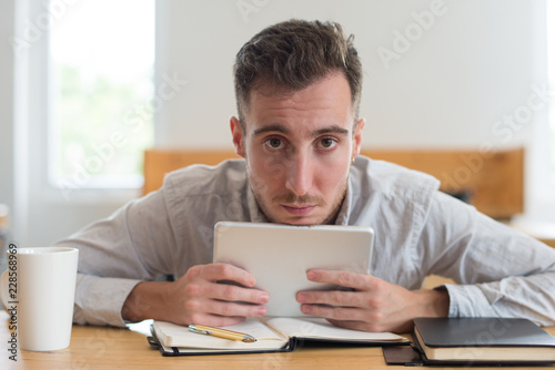 Serious male student holding tablet and looking at camera in classroom. Young man browsing on gadget at desk. Education and technology concept. Front view.