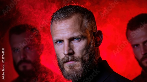 Serious man with beard looking at the camera, two blurred men behind him in red light