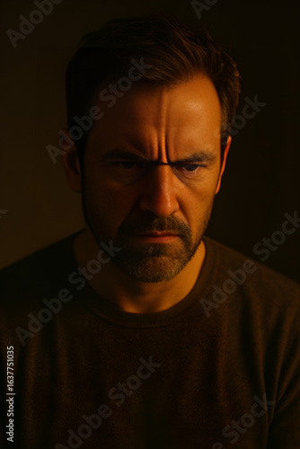 Serious middle-aged man with furrowed brow and intense expression in moody lighting