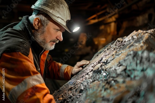 Serious miner with helmet light inspecting ore body in the dark underground mine for extraction