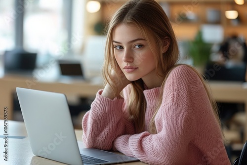 Serious thoughtful young university student girl typing on laptop in public library, thinking on report, article, essay, research paper, studying on Internet, sitting at table with open books
