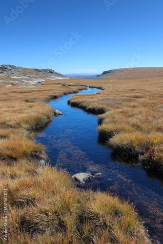 Serpentine stream meanders through autumnal grasslands under a clear blue sky