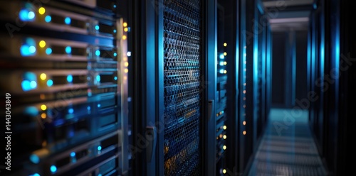 Server corridor with glowing blue and yellow LED indicators and metallic mesh panels, representing secure digital systems, cloud computing, and advanced network infrastructure