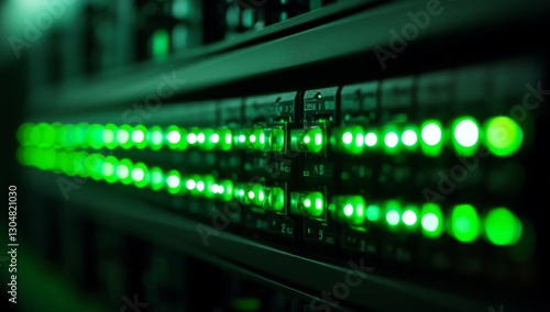 Server rack lights glowing green in data center