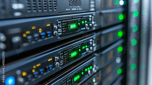 server racks in a data center with blurred background symbolizing technology, data processing, and the backbone of modern information infrastructure