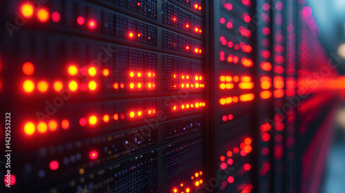 Server racks with bright alerts, symbolizing threats to data security and infrastructure