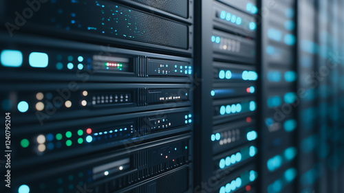 Server Room Data Center: Rows of powerful servers hum with activity in a modern data center, their glowing lights creating a mesmerizing technological landscape.