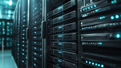 Server Room with Illuminated Network Equipment and Data Storage Units