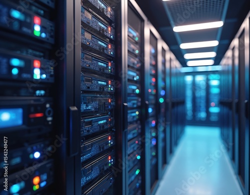 Server room with many server racks stacked on. Modern data center with high-tech equipment, servers, cabling. Database servers, computing, cloud, data storage, backup. Digital cyberspace, cyber