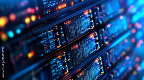Servers rack illuminated with lights, showcasing data processing and network infrastructure