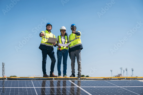 Service engineer checking solar cell on the roof for maintenance if there is a damaged part. Engineer worker install solar panel. Clean energy concept.