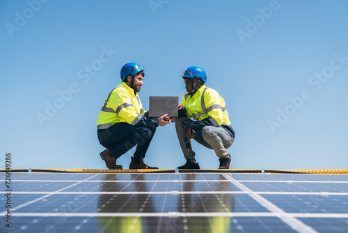 Service engineer checking solar cell on the roof for maintenance if there is a damaged part. Engineer worker install solar panel. Clean energy concept.