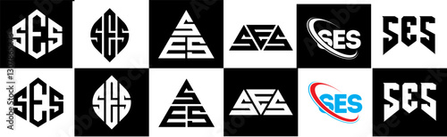 SES letter logo design in six style. SES polygon, circle, triangle, hexagon, flat and simple style with black and white color variation letter logo set in one artboard. SES minimalist and classic logo