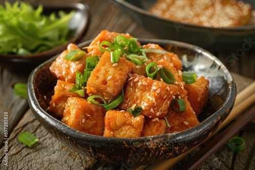Sesame-Glazed Tofu with Green Onions in a Black Bowl