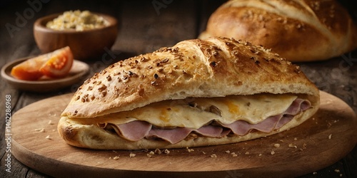 Sesamüberbackenes Sandwich mit Schinken, Champignons und geschmolzenem Käse auf dunklem Holzbrett serviert