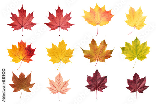 Set / Collection of colorful maple leaves isolated on transparent background cutout PNG , ai generative