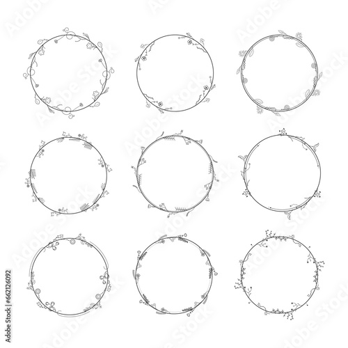 Set Abstract Black Collection Simple Line Round Circle With Leaf Leaves Frame Flowers Doodle Outline Element Vector Design Style Sketch Isolated Illustration For Wedding And Banner