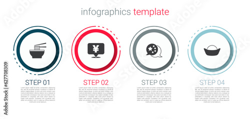 Set Asian noodles in bowl, Chinese Yuan currency, China flag and Sushi. Business infographic template. Vector