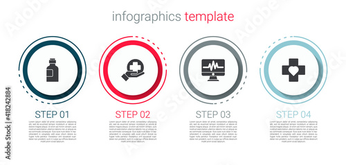 Set Bottle of medicine syrup, Cross hospital medical, Monitor with cardiogram and Heart cross. Business infographic template. Vector.