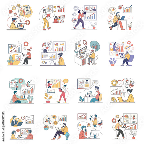 set business flat vector illustration design cartoon character working action style concept. online video conference meeting. finance investment business planning. data analytics. finance investment.