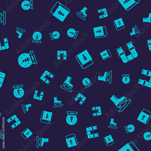 Set Christmas snow globe, Winter scarf, book and Skates on seamless pattern. Vector
