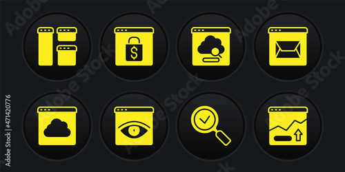 Set Cloud technology data transfer, Website and mail, Browser incognito window, Magnifying glass with check mark, Online shopping on screen, Financial growth increase and icon. Vector
