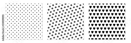 Set, collection of three vector seamless pattern backgrounds with black and white sign and symbols, hearts, dots, flowers for graphic design.
