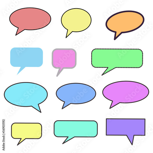 Set different dialog box, frame, speech balloon bubble colorful red violet yellow blue color in black line frame on grey background, Empty blank comment Talk chat speak message, illustration pop art d
