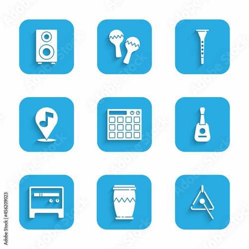 Set Drum machine, Triangle, Guitar, amplifier, Location musical note, Clarinet and Stereo speaker icon. Vector