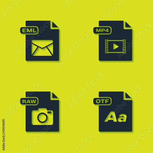 Set EML file document, OTF, RAW and MP4 icon. Vector.